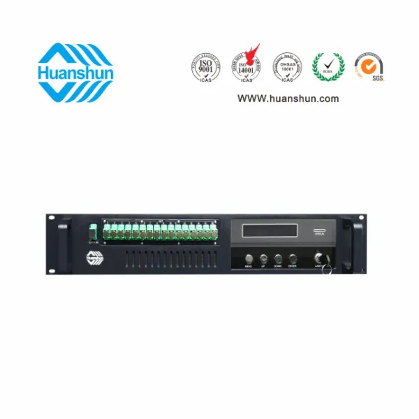 大功率光纖放大器 | YGF1516-16 | 19 " 2U/3U標準機箱,-5 ~ +10 d Bm輸入,16路標稱規格(16、17、18、19、20、21、22、23、24dBm)放大輸出,并支持下調-2dB,安全連接模式,NF ≤ 5dB(0dBm時);內置FWDM合波器,插播損耗 ≤ 1dB;雙模塊熱插撥電源,AC90 ~ 255V或DC-48V供電,RJ45標準網管(支持SNMP、WEB) |